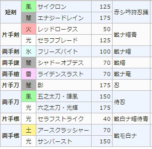 赤弱点を突くには、決められたウェポンスキル(以下WS)のどれかを当てる。WSは13種類と決まっているが(下表;Final Fantasy Wikiより抜粋)、どれか1つだけが当たりで、どれになるかはランダム。さらに当たりのWSを打っても毎回弱点を突けるわけではないので、何度か撃ってみる必要がある。
