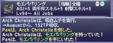 現状ではPaqが戦/侍、Aidが忍/シでWSを分担しているのだが、もう少し頑張ればPaq一人で全ての弱点WSを撃てるようになるらしい。