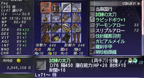 Paqは忍者の時には乱波脚絆改(Lv74)を愛用している。「夕方~早朝:移動速度25%アップ 」という他では得られない性能が付いているためだ。