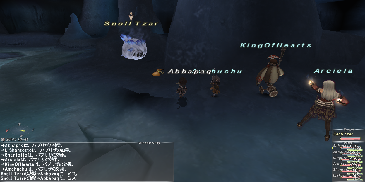 途中、敵ヒュームにパライズを入れてみたら、敵はタルタルでなくPaqを攻撃するようになった。こいつを削ると死ぬ前に猛攻撃をしてくるらしいので、パライズ以外は何もしないでいた。むしろタルタルよりPaqが殴られた方がHPの減りも遅いし痛くないのでありがたい。と思っていたら盾のアークEVがタゲを取ってくれた。これでPaqもタルタルNPCも殴られない。