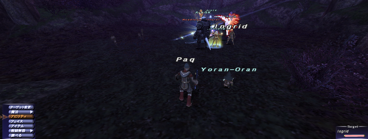 上の写真のように、Paqとヨランオランは離れて立って、Paqはイングリッドへにケアル5か6をかけまくった。きつい範囲攻撃を食らって前衛陣が危ないときには、アークEVにケアルガ3か4をかけた。フェイスにケアルガすればイングリッドにも効果があるらしい。