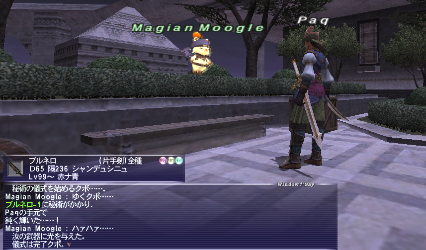 が、シャンデュシニュなどのWSは、いわゆる「コイン武器」というものを鍛えれば習得できる。この鍛え方についても、以前はNMを300匹倒すのを何段階も繰り返すというような恐ろしく手間がかかるものだったが、NM回避ルートというものがあて、アイテムさえ揃えれば戦闘なしで習得できる。