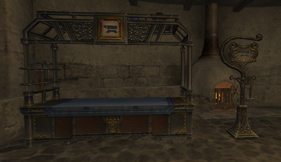 ベッドのようだ。ちなみに右は鍛冶師サインボード、右奥はバスのモグハウスに備え付けの暖炉(?)だ。