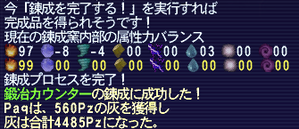 合成と違って錬成は、失敗しても素材が無くならない。なので完成させずにフュエル(クリスタルのようなもの)をどんどんつぎ込めば良い。暴発しても構わないが、暴発しそうになったら「たたく!」を選ぶ。たたく!でもスキルが上がる(とはいえ65から80まで上げる間に たたく!でスキルが上がったのは1度だけだった)。