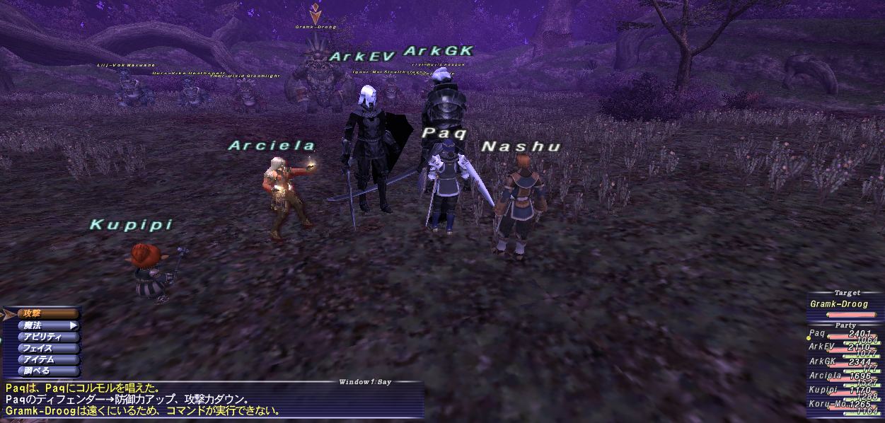 魔導剣士で挑みたいところだが、この敵は範囲魅了を持っている。Paqが魅了されるとフェイスは全部消えてしまう。数分待てば魅了が解けるが、その頃には敵は黄色ネームになりHPが全回復しているか、悪くすると敵自体が消えてしまう。