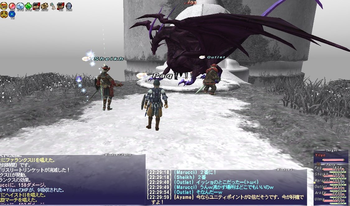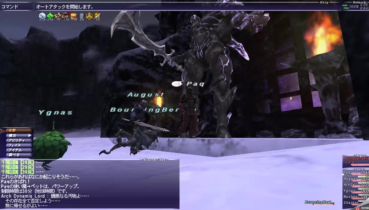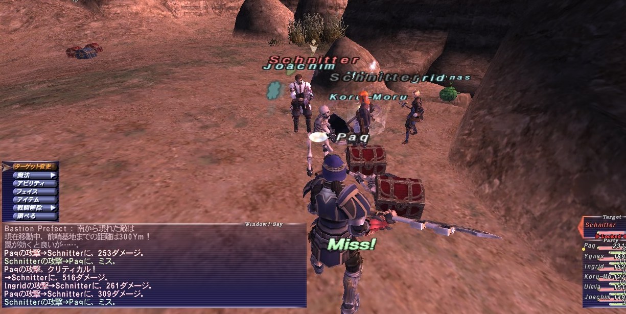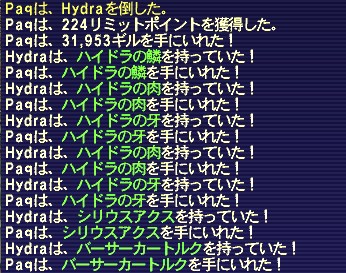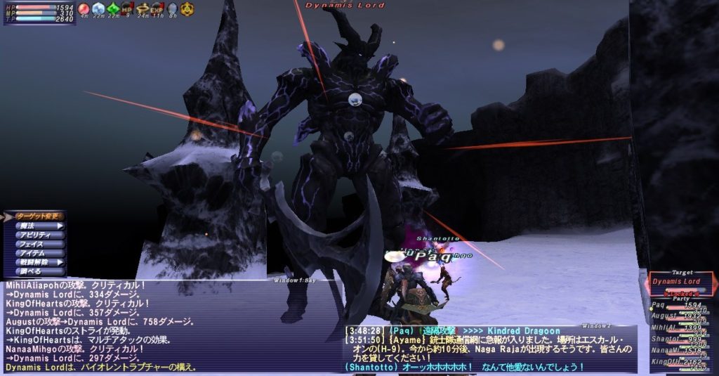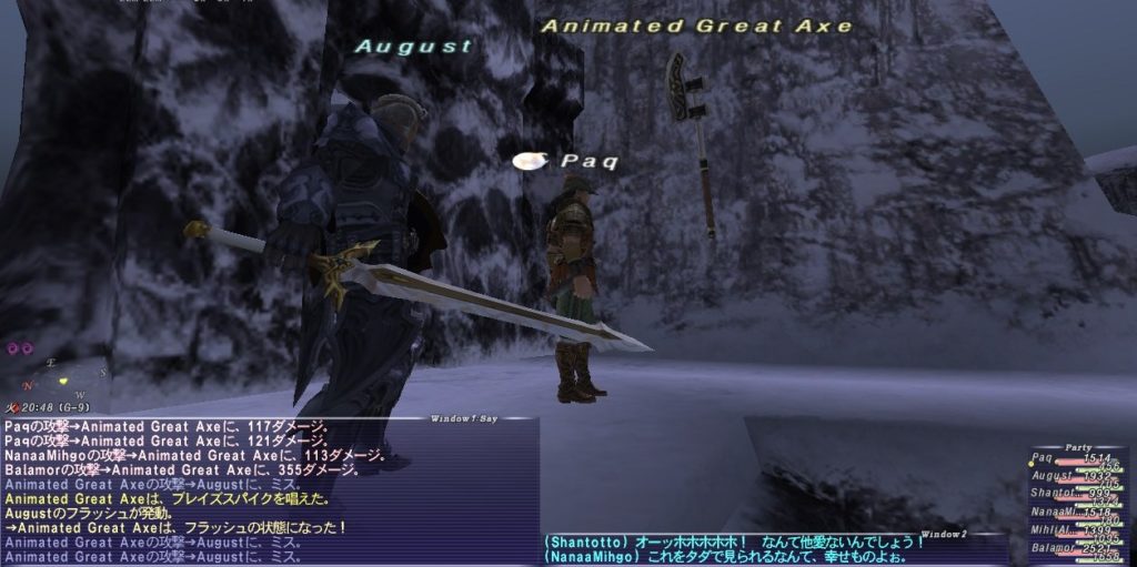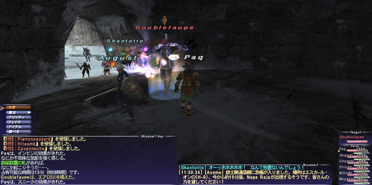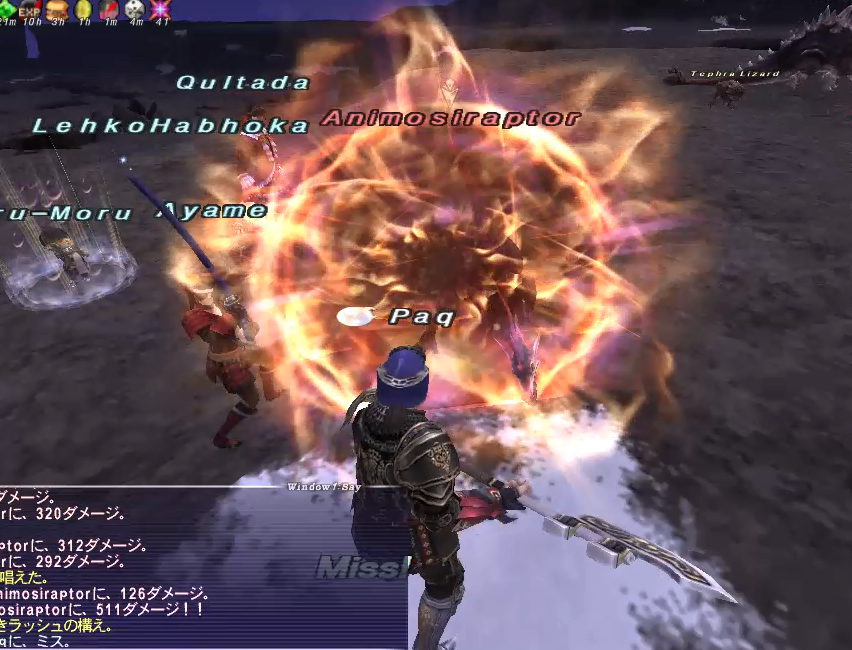 アークTTがスリプガしてくれたのは予定通りだし、首尾良く全部寝てくれたが、寝る直前に集中攻撃を食らい、PaqのHPがいきなり300台まで削られた。すぐにケアルしてもらったので事なきを得たが、危うく瞬殺されるところだった。