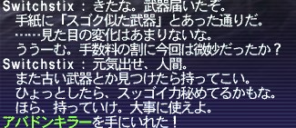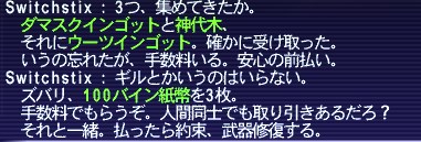 すぐに第2段階の素材を渡した。なお ルンゴナンゴ翠貝貨は手持ちが13枚あり、3枚不足だったので、ジュノのバザーで買った。競売24万ギルのところ、18万ギルで買えた(18*3=54万ギル)。