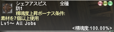 初期状態だとスキル-30の盾を受け取り、装備して合成すると少しずつ精魂度が0から増えていき、スキルマイナスが減る。精魂度100%になるとマイナスが消える。この状態になったらギルドマスターにトレードする。さらに別の納品物件を渡してポイントを貯めてアイテムと交換し、盾とアイテムをセットでトレードすると、合成スキル+1の盾にしてもらえる。
