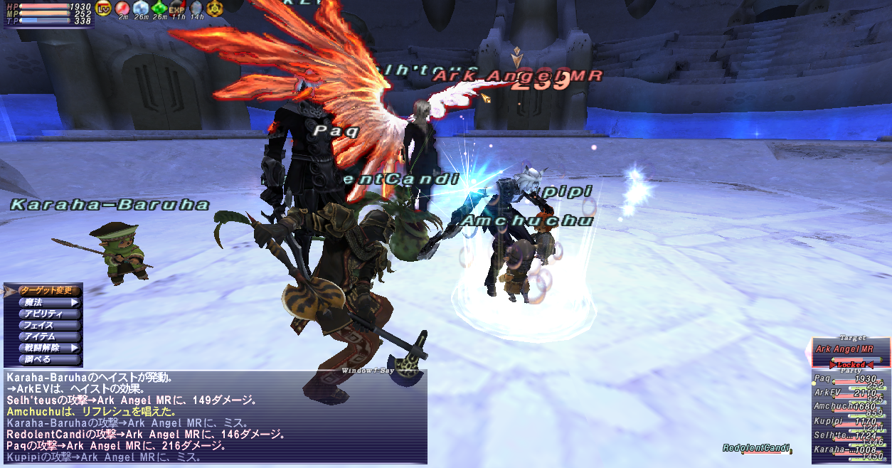 アークMRのジョブは獣使いで、「あやつる」を使ってくるようなので、自分が操られるとフェイスが消えてしまって負けるので、こちらも獣使いで行った。ペットやフェイスがタゲを持っていれば操られずに済む。まぁ獣でなく白や詩人などのようなジョブで行って大人しくしていれば構わないのだが。
