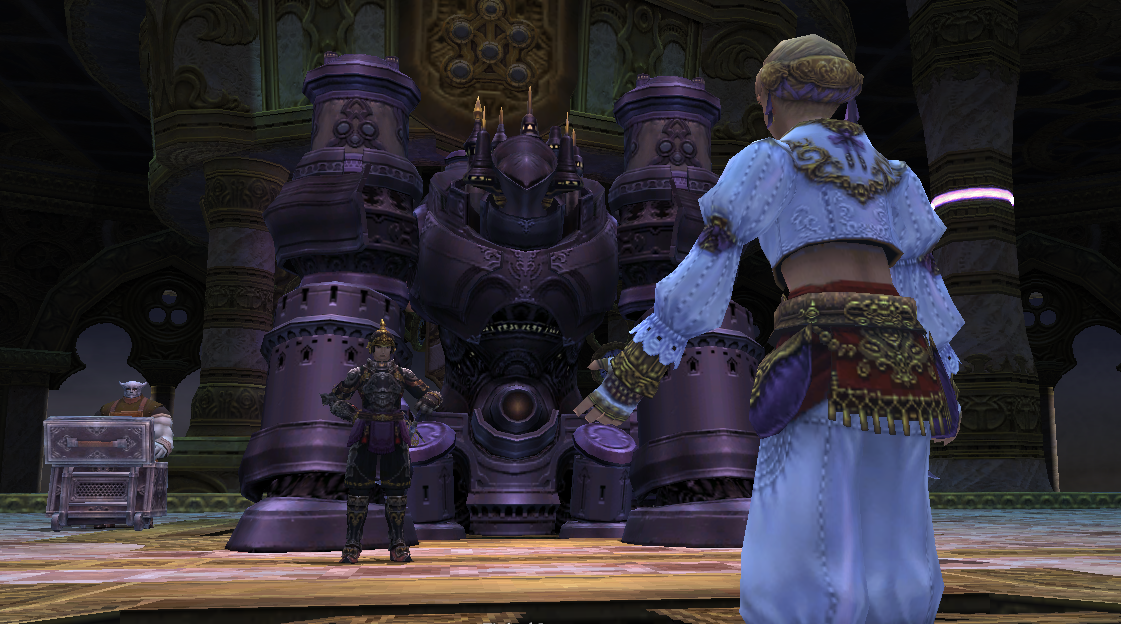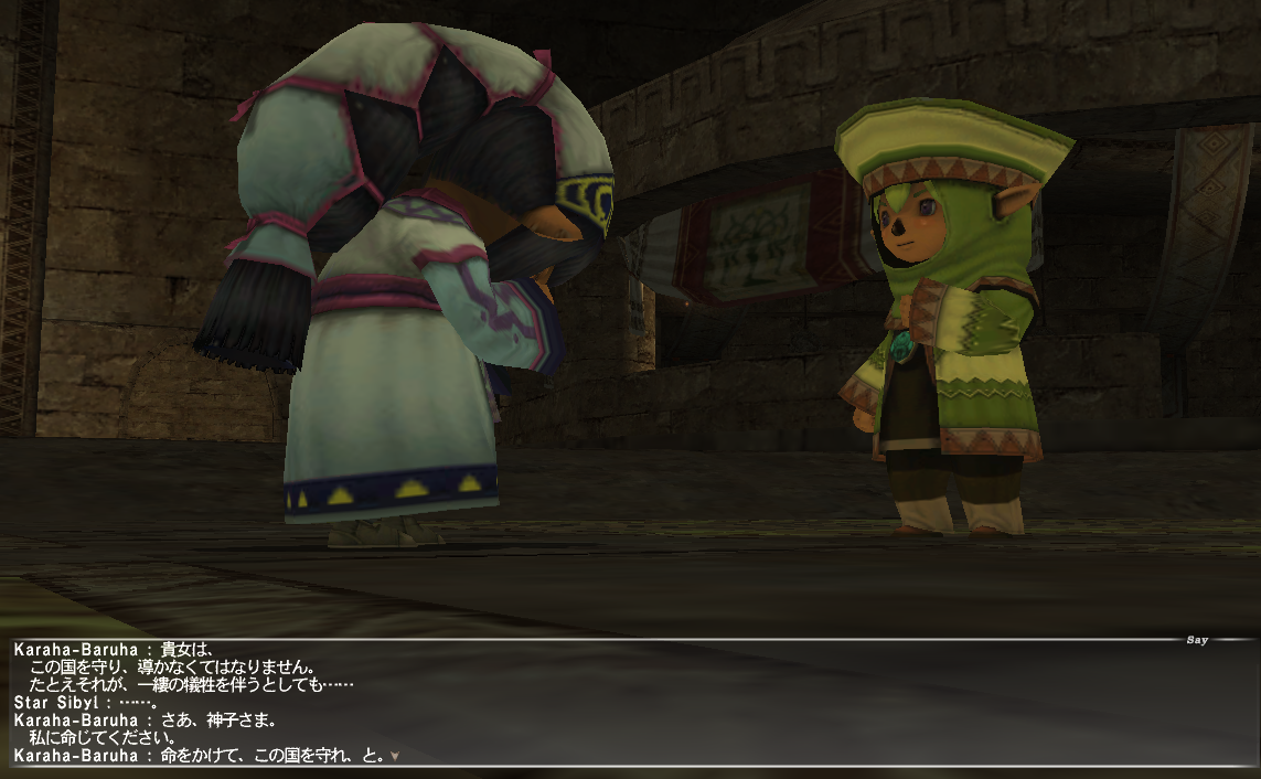 過去ウィンでのカラハバルハと星の神子。2002年のFF11開始の頃から星の神子が「教えて、カラハバルハ・・」等と言っている理由がようやく分かるシーン。