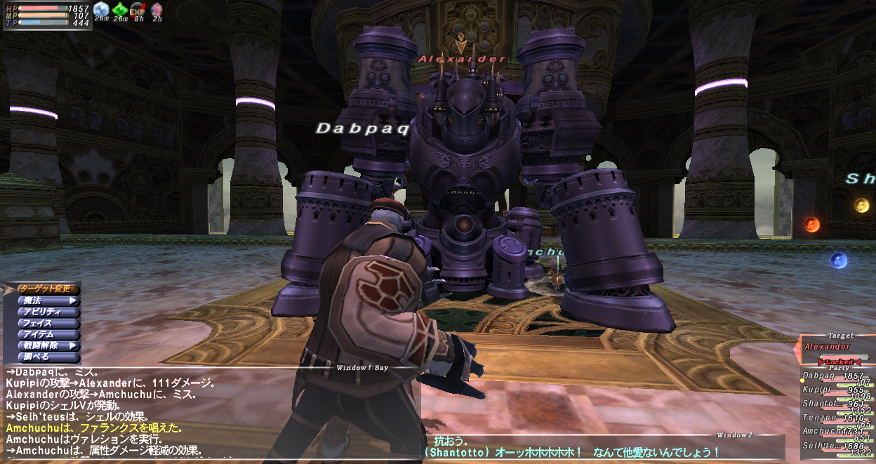 こちらのフェイスは、アークEV、アムチュチュ、クピピ、セルテウス、カラハバルハ。ジョブで言うとナナ剣獣白白(セルテウスは一応ナイトだが盾ではない)。盾を2枚にしておけば、もし1人が死んでももう1人が盾になるので操られる心配がない。また的のペットが何度か呼び出されるので、MR用盾とペット用盾が居てくれれば安定する(そんな風にフェイスが振る舞ってくれるかはむず怪異と思うが)。範囲攻撃がきつそうなので白を2人にして、セルテウスのリジュヴァネーションでHPMPの回復をしてもらう。