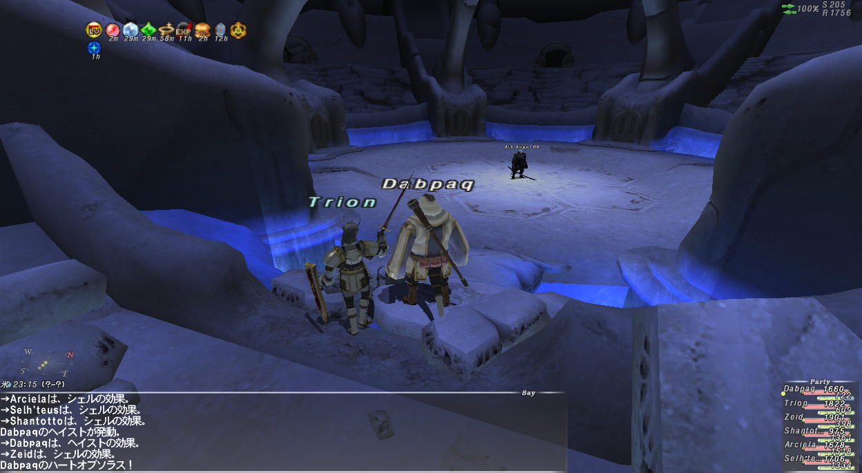 フェイスは、ArkEV、シャントット2、アヤメUC、コルモル、クピピ。範囲攻撃がほとんど無く、前方範囲攻撃は立ち位置さえ気をつければ盾のArkEVしか食らわないので、セルテウスがあまり役に立たなかった。そのため今回は、普通に醴泉島でジョブポ稼ぎに行くときの構成にした。シーフの自分とアヤメで連携、シャントットでMBすれば、ガンガン削れるはずだ。