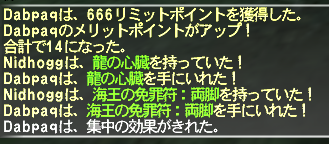 まずDabの3000pを使って甘茶(ニーズヘッグのトリガーアイテム)を得て、ニーズヘッグと戦闘。このためにDabはシーフを99にした。